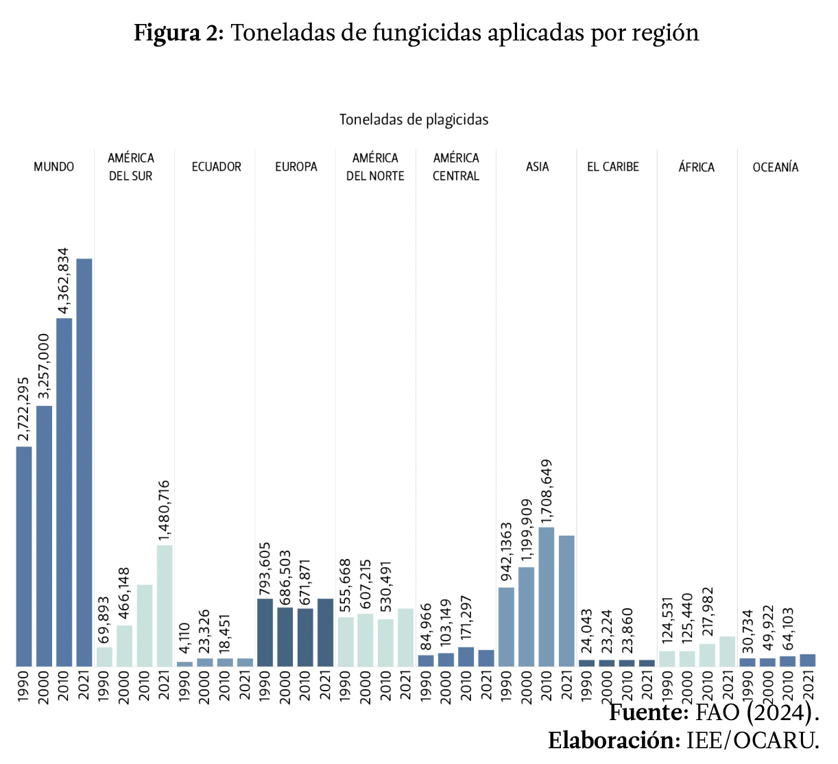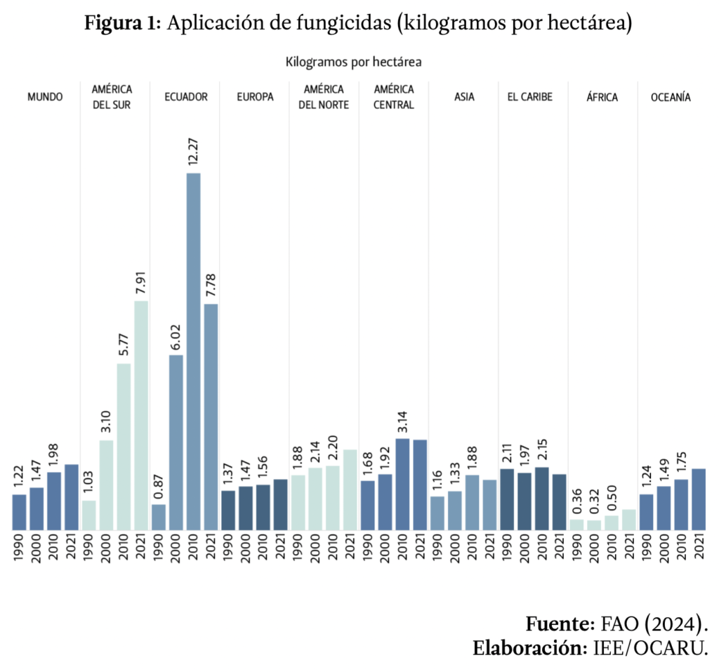 Sudamérica es claramente el territorio con uso más intensivo frente a otras regiones, sin embargo, en términos absolutos, Asia emplea más fungicidas, y Europa empleaba más cantidad de fungicidas hasta la llegada del siglo actual (ver Figura 2). Respecto a Ecuador, pese a que la aplicación en número de toneladas parezca baja, representó el 22% del total de toneladas aplicadas en África. Esto, es un indicio más de la precariedad de las prácticas agropecuarias en el país con el afán de frenar los efectos de la extensión de monocultivos dedicados a la agroexportación y agroindustria.