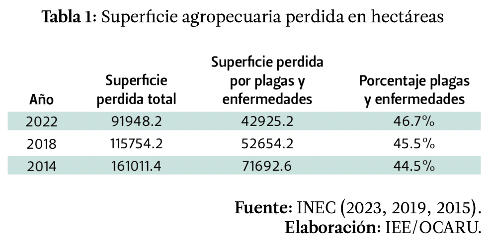 En Ecuador, la superficie agropecuaria perdida por concepto de plagas y enfermedades representa en esta década cerca de la mitad de las causas de pérdida de superficie. Si bien los datos oficiales muestran menores porciones de superficie perdidas en los últimos años, también las pestes y enfermedades han ido incrementando su importancia (ver Tabla 1). Y a la par de la importancia también la importación de los insumos para enfrentar ese problema[3], los fungicidas, por ejemplo, pasaron de ser menos de 12 mil toneladas importadas en 2014 a cerca de 15 mil en 2021.