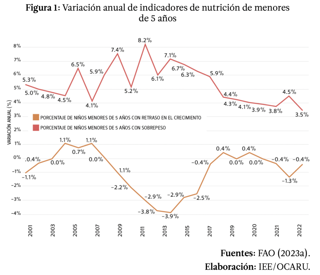 El panorama pinta aún peor con la doble carga de la malnutrición, en donde, además de la falta de nutrientes por parte de la alimentación y la calidad del agua, se suma el consumo excesivo de alimentos que causan sobrepeso, parecería que la tendencia va a la baja desde 2015, sin embargo, la tasa de variación del sobrepeso en niñxs menores a 5 años es positiva en todo este siglo (ver Figura 1), y en el 2022 el porcentaje de niñxs con sobrepeso menores a 5 años fue del 11,9%, mientras que quienes presentaron retraso en el crecimiento fueron el 22,7% (FAO 2023a).