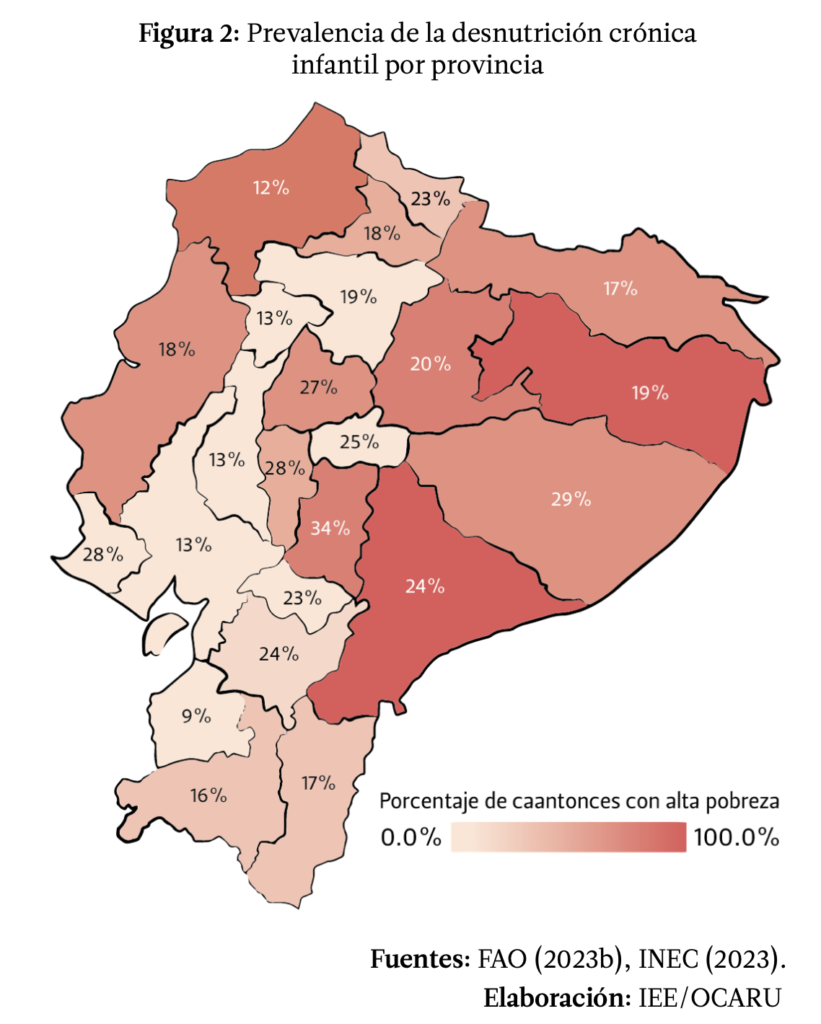 Los datos de la ENDI nos muestran también que la distribución de la desnutrición es distinta en cada provincia, con casos más graves en Chimborazo, Pastaza, Bolívar y Santa Elena (ver Figura 2). Morona Santiago y Orellana se colocaron con las provincias con el mayor número de cantones con alta pobreza en la zona rural de acuerdo a los datos de FAO (2023b). El mapa nos muestra que no necesariamente existe correspondencia entre las provincias con mayor cantidad de cantones con alta pobreza y la prevalencia de desnutrición crónica, sin embargo, es al menos intrigante el caso de Esmeraldas que al ser una de las provincias más excluidas del país tenga una prevalencia de apenas el 12% de acuerdo con los datos de la ENDI. Como lo mencionaba Padzic (2023) las demoras en la toma de información pueden ocultar la falta de precisión en la información obtenida.