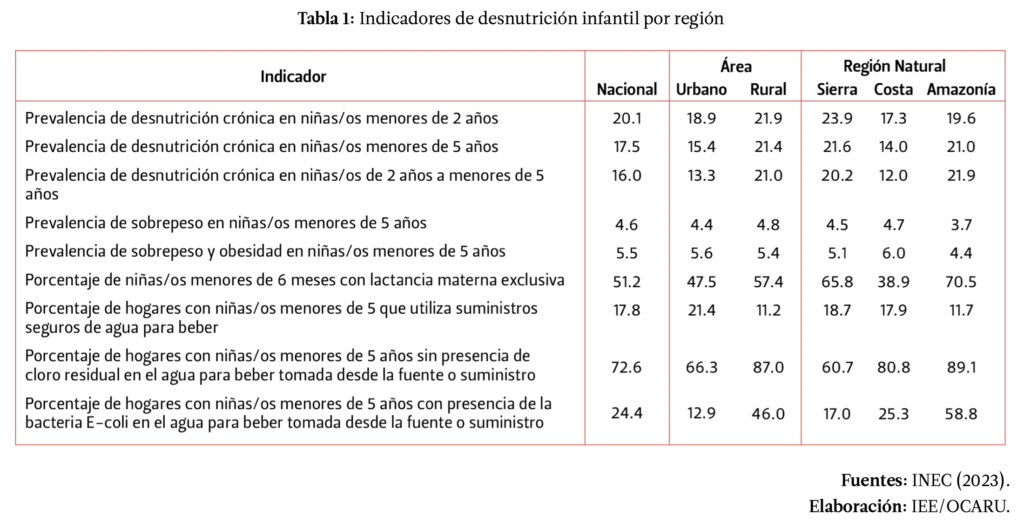 La ENDI también refleja que la zona rural es mucho más vulnerable en los indicadores asociados a la desnutrición en los menores a 5 años. La diferencia entre las zonas rurales y las urbanas es más clara cuando se pone en debate el acceso a fuentes de agua seguras, en este particular dato al menos la mitad de los hogares rurales están expuestos a un tipo de agua con restos que pueden causarles E-coli. También destaca que 6 de cada 10 niñxs menores a 6 meses de la región costa no se alimentan exclusivamente de leche materna.