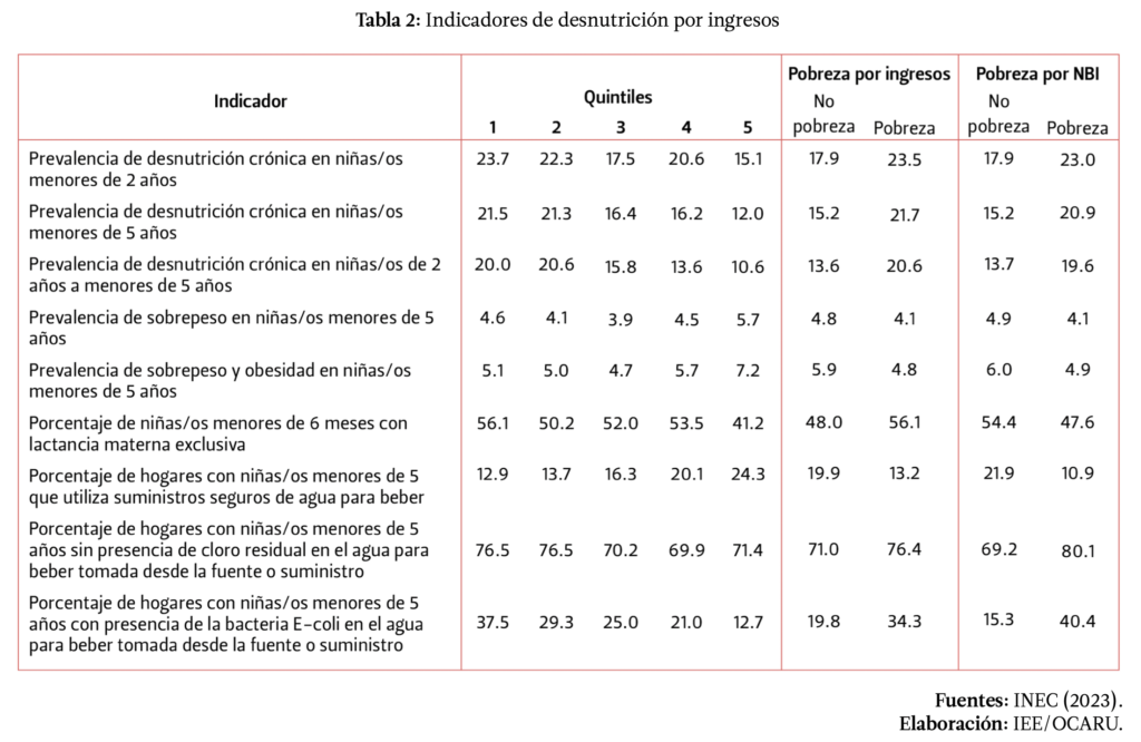 Machado (2022) anticipaba ciertos indicadores de la ENDI respecto a la desnutrición y a los ingresos de los hogares e indicaba que la desnutrición también alcanza a los hogares con altos ingresos. En efecto las cifras de la ENDI, muestran que los indicadores de desnutrición también rodean a los hogares con altos ingresos, y que la pobreza no es el único elemento que puede explicar a la desnutrición (ver Tabla 2). Factores como la alimentación de las madres, y la decisión de no proveerlos de leche materna puede estar asociada a la presencia de la desnutrición en este grupo (Machado 2022), de hecho, es el grupo con menor consumo exclusivo de leche materna (ver Tabla 2). El reemplazo de la leche materna por fórmulas que provienen de la industria de los ultrapocesados también es uno de los elementos que se relacionan a la malnutrición infantil, y dada la influencia de esta industria en las políticas y programas país el consumo de estos productos cada vez se incrementa (Torres et al. 2024).