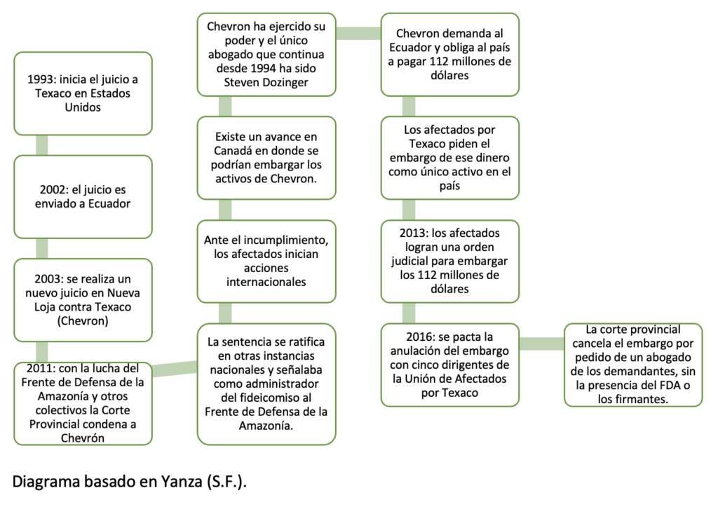 Posteriormente, en 2018, la Corte Permanente de Arbitraje, con sede en La Haya, señaló que el gobierno ecuatoriano debe compensar a Chevron debido a que la empresa no fue juzgada de manera justa (Pellegrini et al. 2020). En 2025, esta causa avanzó y se determinó que el pago del Estado a la empresa ascendía a 220 millones de dólares, decisión que fue celebrada por el gobierno de Daniel Noboa debido a que el monto solicitado por Chevron era de 3350 millones (Ruiz Agila 2025).