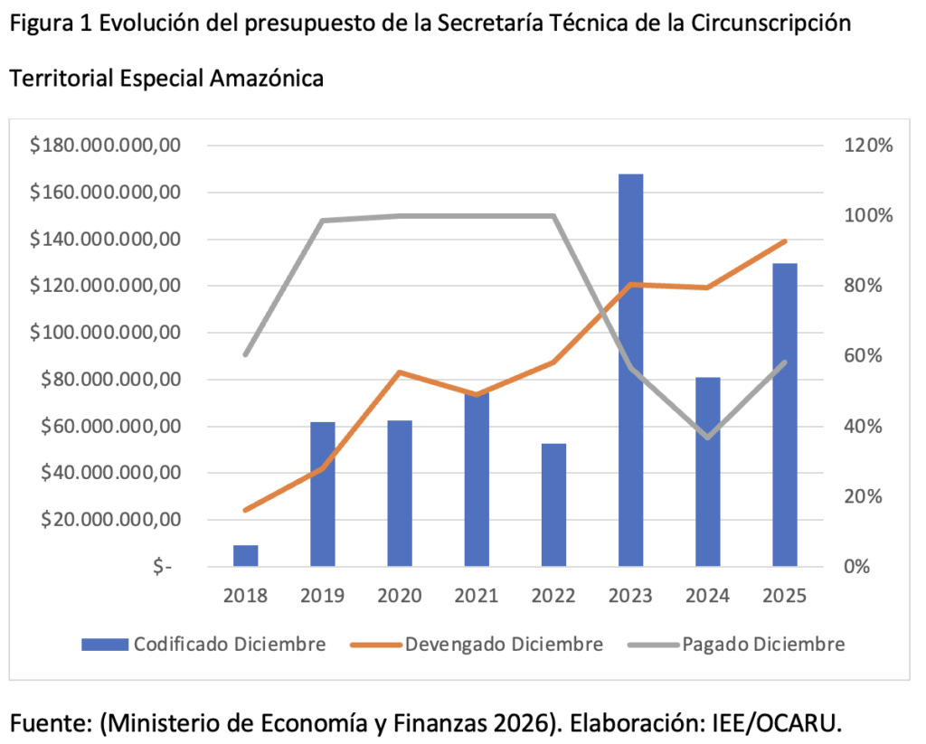 La ley creó dos fondos: uno para el Desarrollo Sostenible, el cual se basa en el 4% de cada barril de petróleo comercializado, y un mínimo de 2 dólares, este está dirigido casi en su totalidad a los Gobiernos Autónomos Descentralizados para obras de fomento productivo y de saneamiento. El segundo es el Fondo Común para la Circunscripción Territorial Especial Amazónica, el cual se compone en un 60% de las regalías de las empresas que explotan petróleo y minas. Este fondo está administrado por una secretaría técnica específica y es el que las personas con enfermedades catastróficas deberían utilizar. La evolución del presupuesto de la Secretaría Técnica de la Circunscripción Territorial Especial Amazónica se muestra a continuación: