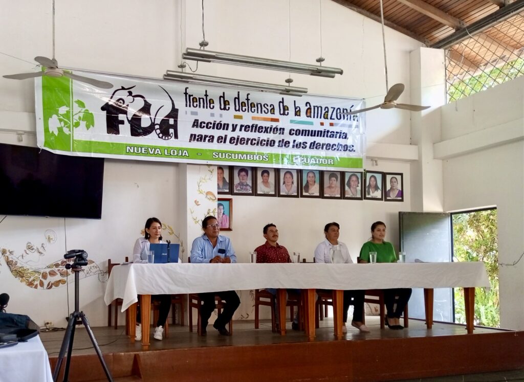 Foto - David Singaña. 18 de julio de 2022, mesas de trabajo del Frente de Defensa de la Amazonia. En la foto está el directorio del FDA.